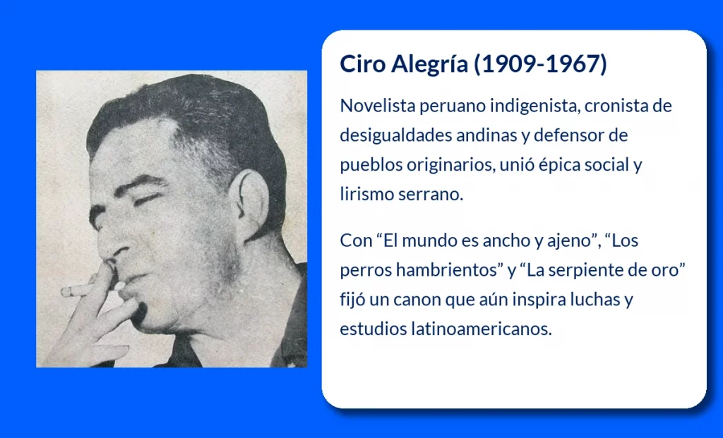 MCN Biografías, 2025. "Ciro Alegría (1909-1967): El Maestro de la Literatura Indigenista Peruana". Disponible en: https://mcnbiografias.com/app-bio/do/alegria-ciro [consulta: 18 de octubre de 2025].
