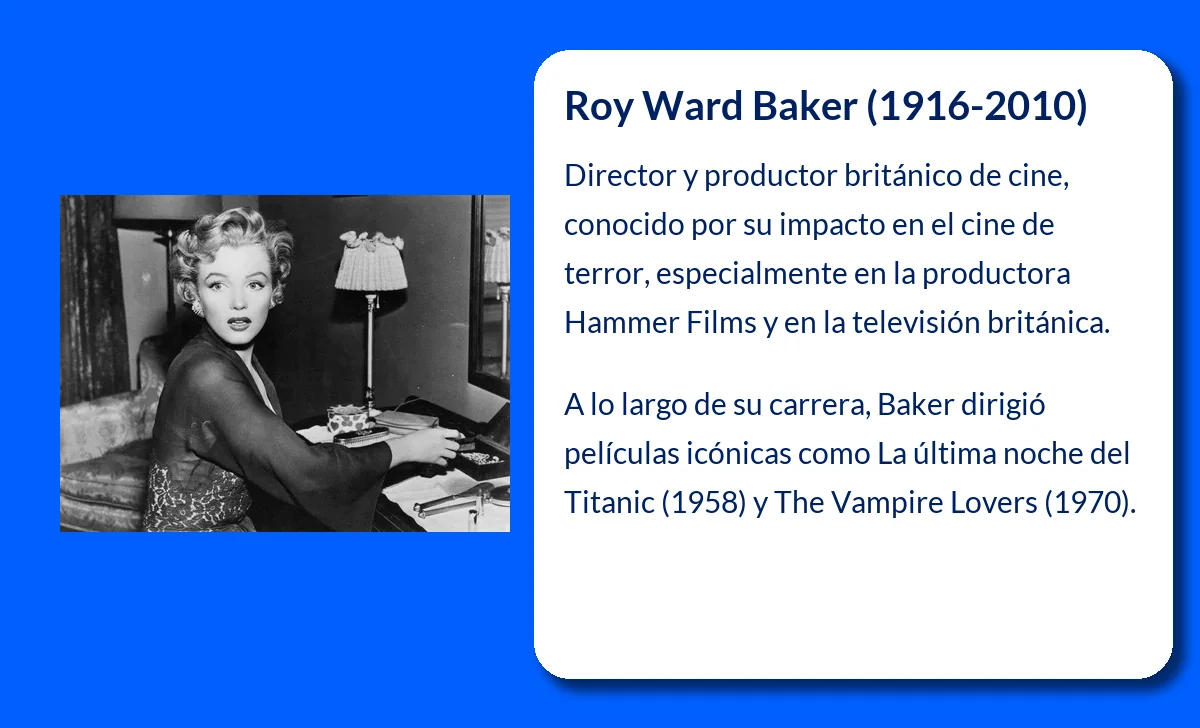 MCN Biografías, 2025. "Roy Ward Baker (1916-2010). El legado del director británico que definió el cine de terror de Hammer". Disponible en: https://mcnbiografias.com/app-bio/do/baker-roy-ward [consulta: 18 de octubre de 2025].
