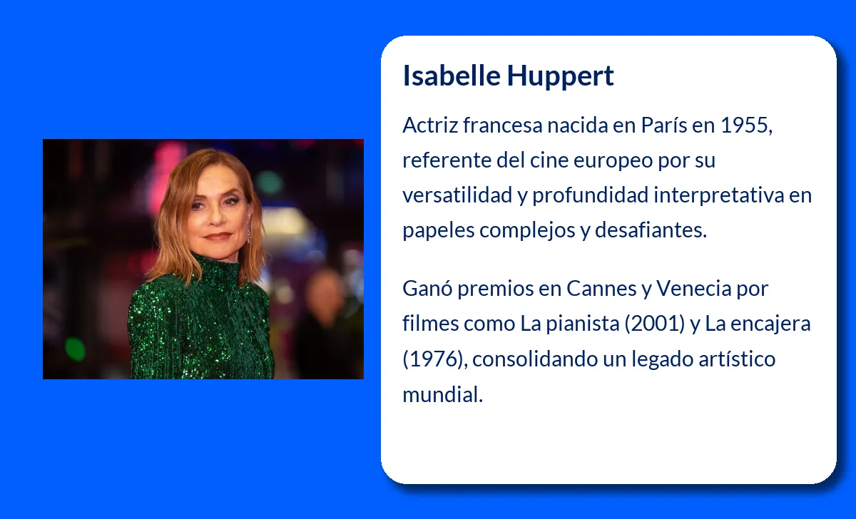 MCN Biografías, 2025. "Isabelle Huppert (1955-VVVV): La Reina del Cine Europeo y su Increíble Trayectoria". Disponible en: https://mcnbiografias.com/app-bio/do/huppert-isabelle [consulta: 18 de octubre de 2025].