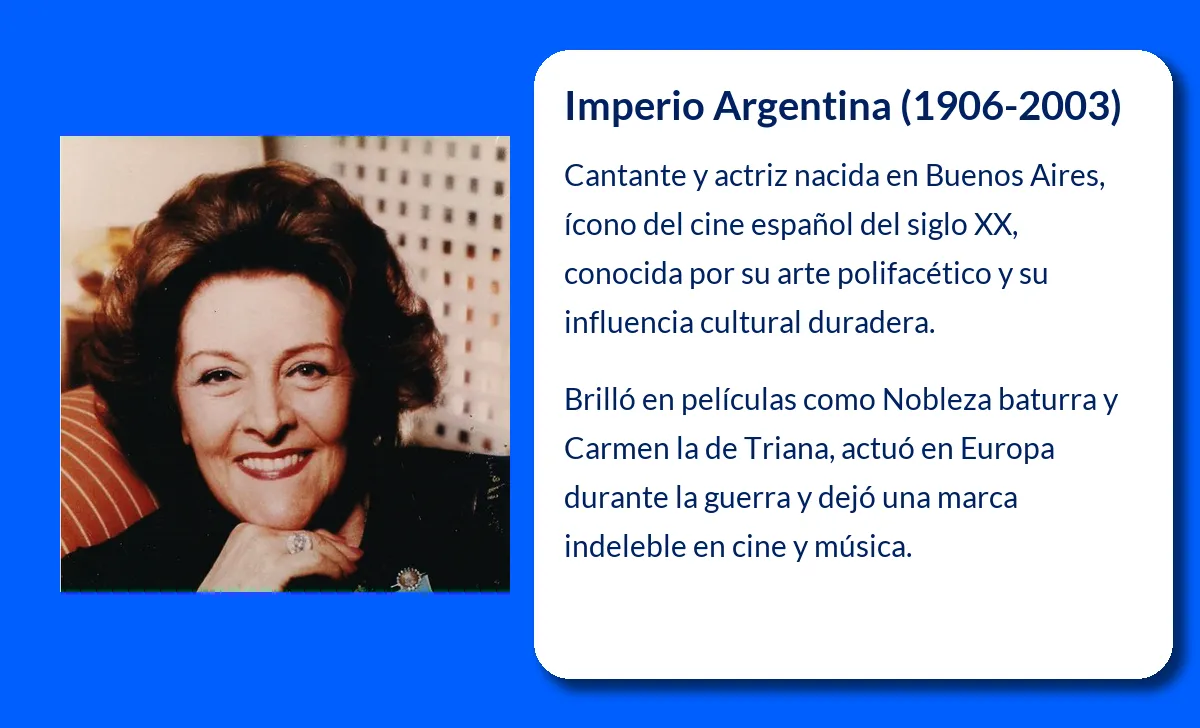 MCN Biografías, 2025. "Imperio Argentina (1906-2003). La Reina del Cine Español y su Legado Inmortal". Disponible en: https://mcnbiografias.com/app-bio/do/imperio-argentina [consulta: 18 de octubre de 2025].