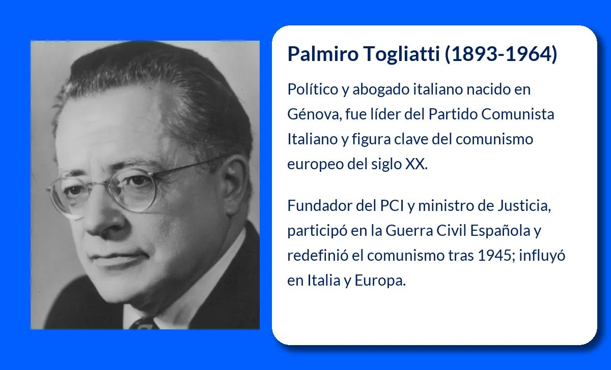 La Guerra Civil Española (1936-1939): Durante este conflicto, Togliatti desempeñó un papel crucial en la organización del Partido Comunista de España. Fue parte de la dirección que ayudó a la causa republicana, aunque, con el tiempo, las decisiones políticas tomadas por él y otros líderes internacionales fueron motivo de controversia, incluida la caída de los gobiernos republicanos moderados.