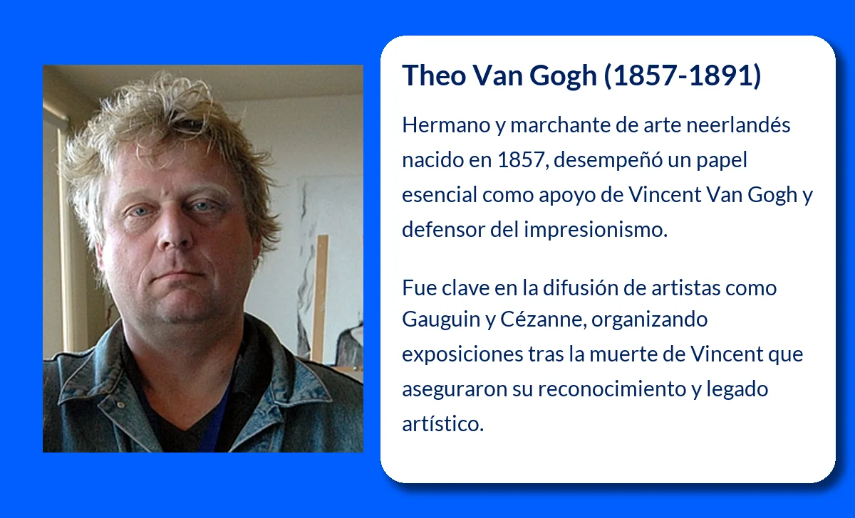 Theo Van Gogh jugó un papel esencial en la vida y carrera de varios artistas contemporáneos, pero su contribución más significativa fue, sin duda, su apoyo incondicional a su hermano Vincent. Como marchante de arte en Goupil, Theo tuvo acceso a una red de artistas y coleccionistas de renombre, lo que le permitió promover la obra de su hermano y de otros artistas del movimiento impresionista.