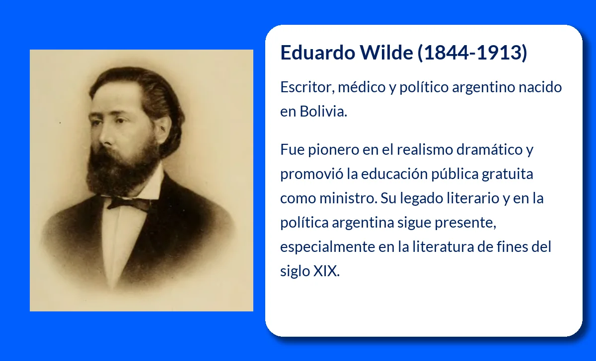 Eduardo Wilde fue una de las figuras más destacadas en la historia argentina de finales del siglo XIX y principios del siglo XX, no solo por su labor literaria, sino también por su importante aporte en la política y la medicina. Nacido en Bolivia en 1844, Wilde se trasladó a Argentina desde temprana edad, donde se consolidó como escritor, médico y político. A lo largo de su vida, se dedicó al estudio y la práctica médica, pero también dejó un legado literario de gran valor, especialmente en el campo del realismo dramático y el humor. Además, su participación en la vida política del país fue trascendental, ocupando puestos clave como el de ministro de Instrucción Pública y ministro del Interior.